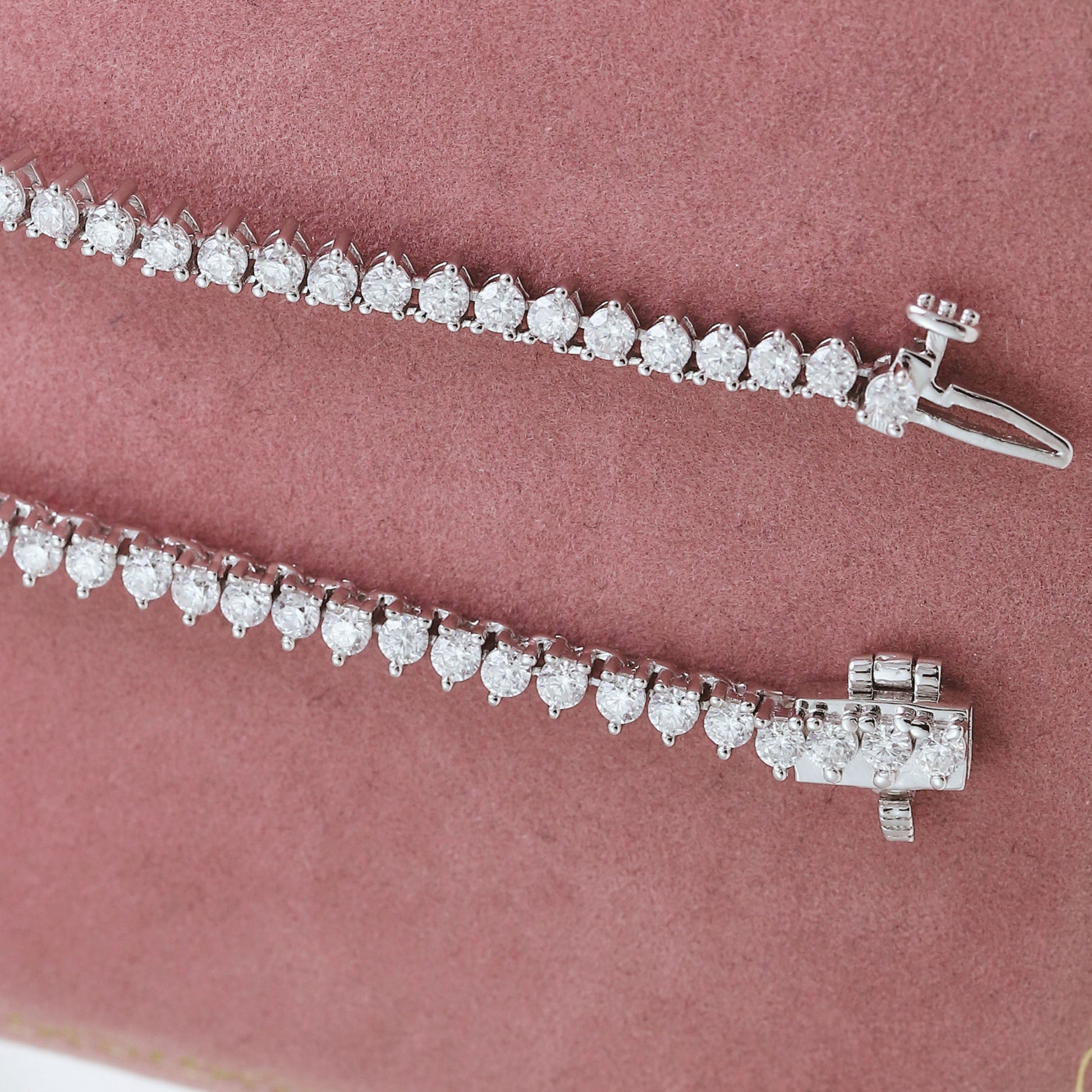 Indulge in luxury with our Classic 3-Prong Moissanite Tennis Necklace. Crafted in gold dipped sterling silver, the slim design features evenly sized colorless moissanite stones set in a 3 prong setting for a stunning sparkle and superior shine. The seamless box clasp with double latches adds a touch of elegance to this one of a kind necklace. Upgrade aura with tastefully elegant piece.